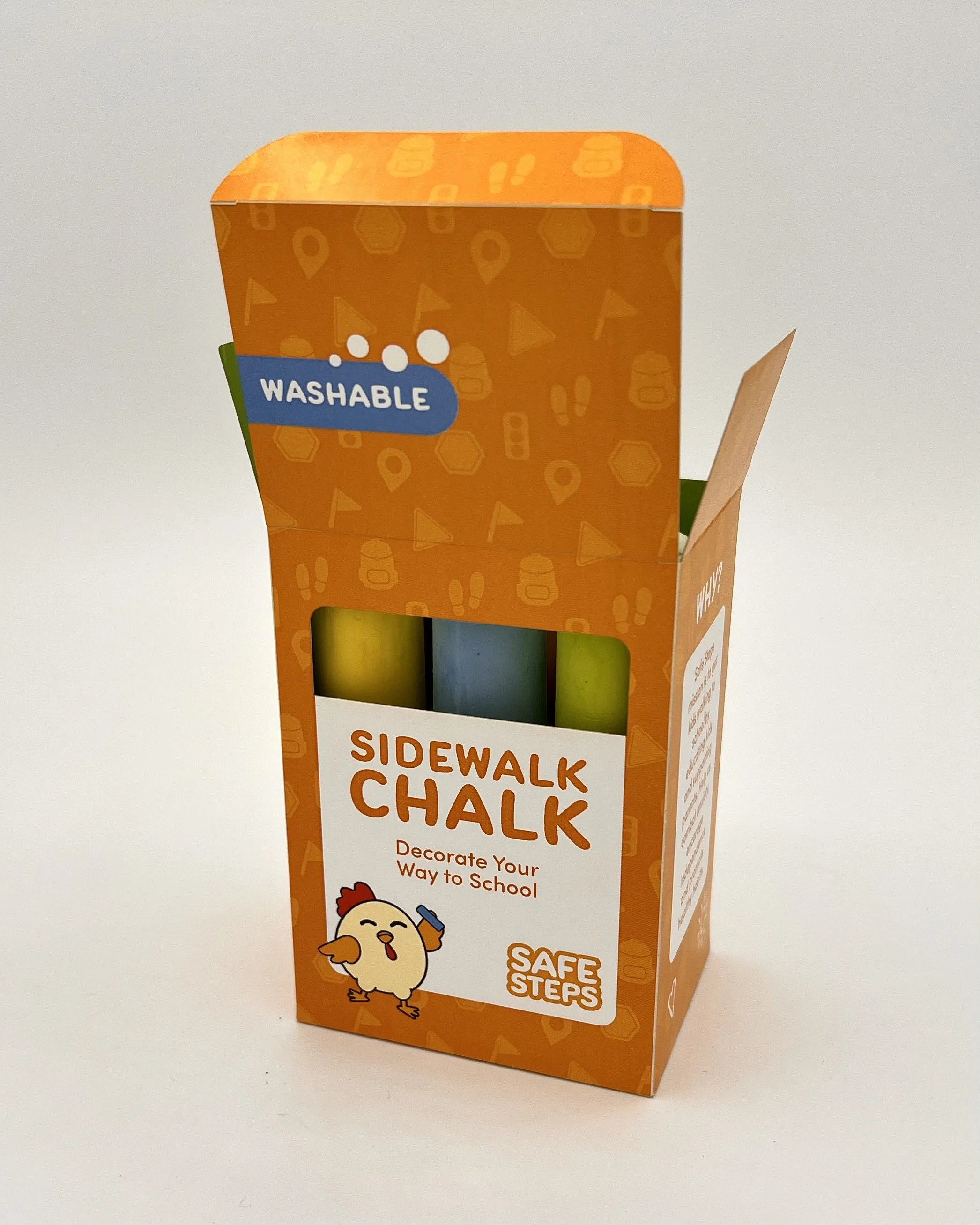 Safe Steps sidewalk chalk is an activity for kids and parents to do together with the goal of creating a fun environment to walk to school. The canvas is their driveway, sidewalk, neighbors sidewalk, school sidewalk and the subject is games and challenges to complete on their route to school such as hopscotch, hopping into shapes, or balancing on a drawn line. A booklet of inspiration comes in the box along with space to sketch ideas. Also included in the pack is a set of flashcards parents can use by filling in their information and practicing with their child. Every child decorating their sidewalk contributes to creating a colorful, fun and strong community.