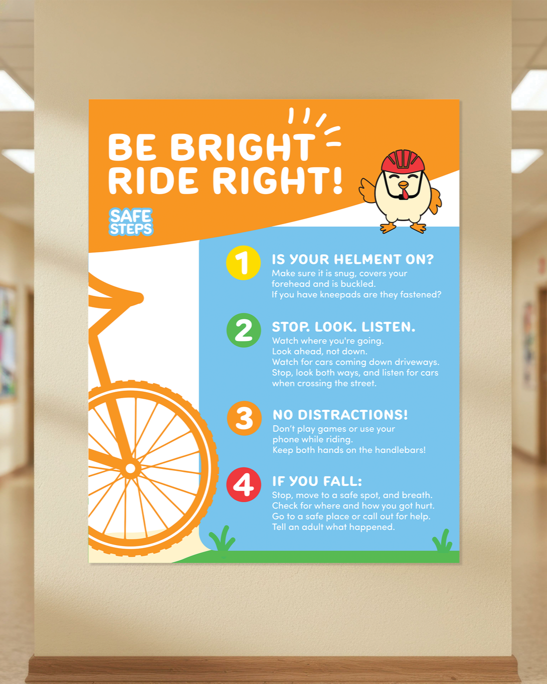 The posters cover road safety, bike/scooter safety, their “safe places,” and remind them to practice their personal information. Additionally, one of the posters provides children with a confidence boost that can be read before dismissal. The information is presented with a large font for the kids and then goes into more detail for the administrators to review with the kids.