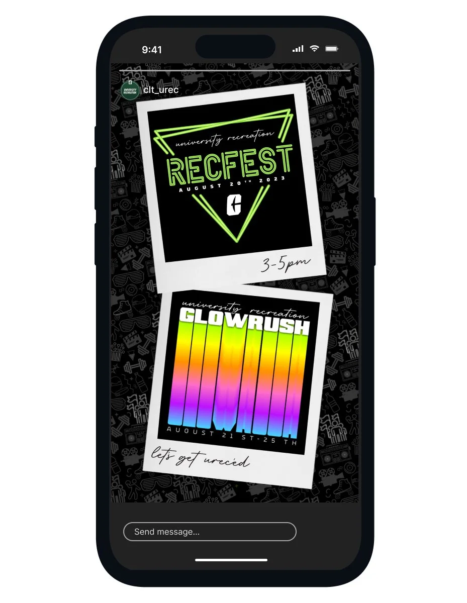 The events were pre-existing and were going to happen on their own. I pitched the idea to combine the events into one campaign under the name GlowRush, as a neon 90’s inspired theme. The events began the day after RecFest and there was one a day meaning promotions needed to be created for 5 separate events with a common brand identity.