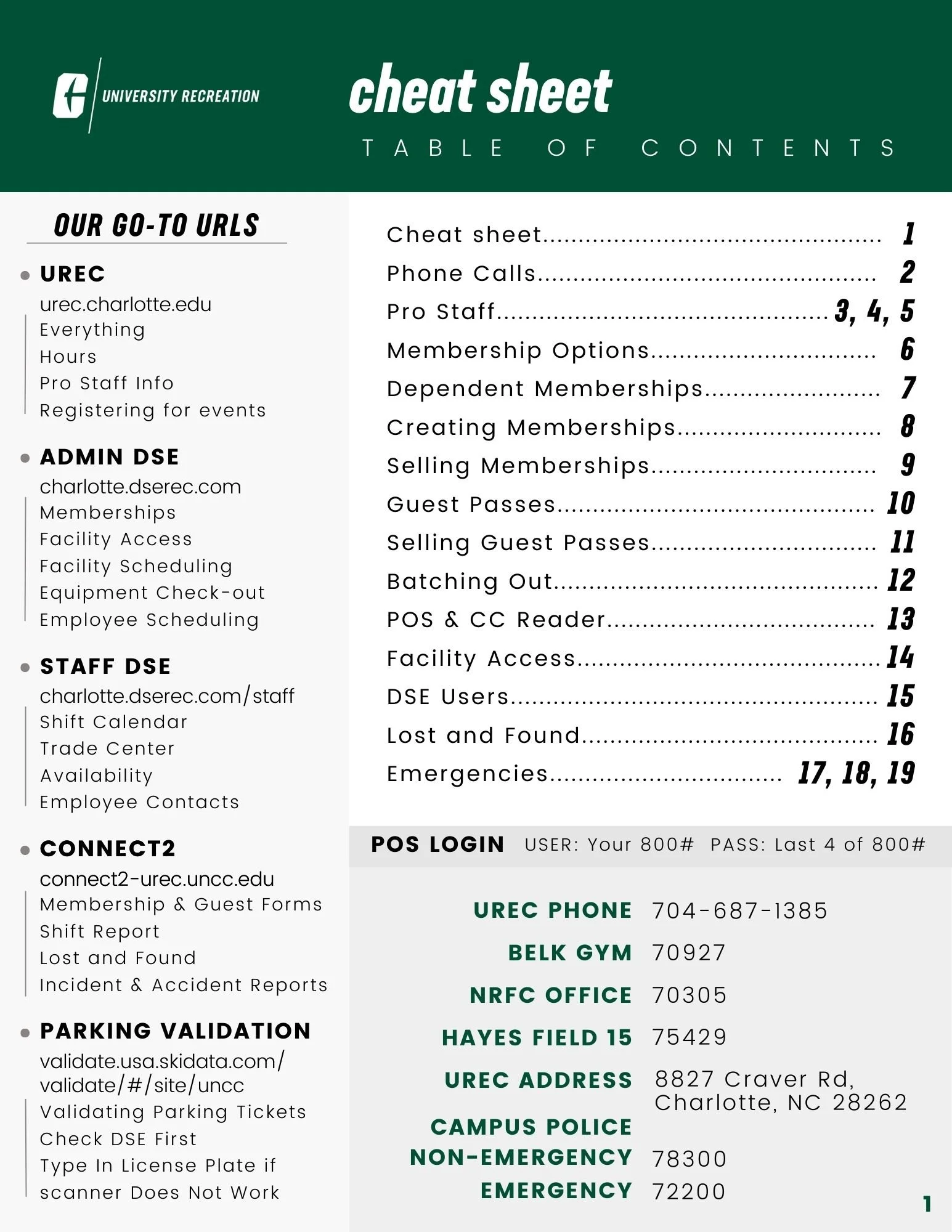 As a continuation of the WDL Handbook, I created a one-page cheat sheet for one of the higher Open Recreation positions. As a Building Manager there are several codes and passwords that need to be known. The amount of passwords and locations needed to be memorized was overwhelming to new Building Managers. As a solution I created this document. Due to the sensitive information it was not printed out, therefore it is designed horizontally so It can be easily viewed on a computer screen. It also shares similar aesthetics of the WDL Handbook.